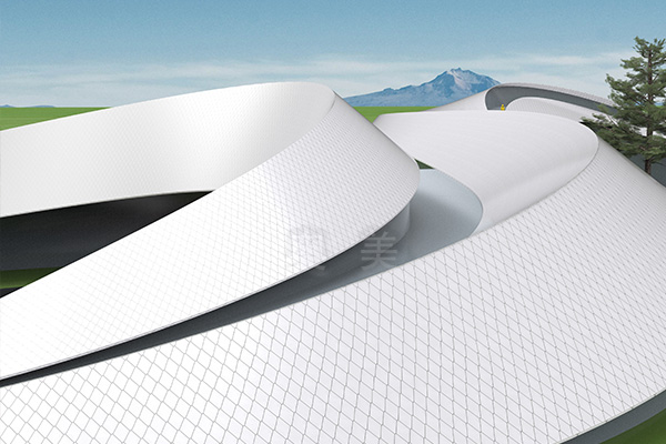 此為眉山展覽館項目,此屋面系統采用的是新型建筑材料金屬...