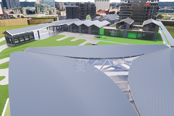 此為惱包奧萊水世界項目,此屋面系統采用的是新型建筑材料金屬復合瓦鋪設...
